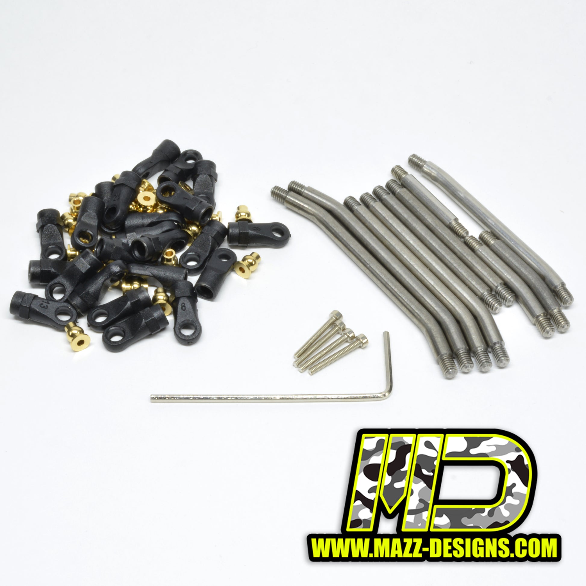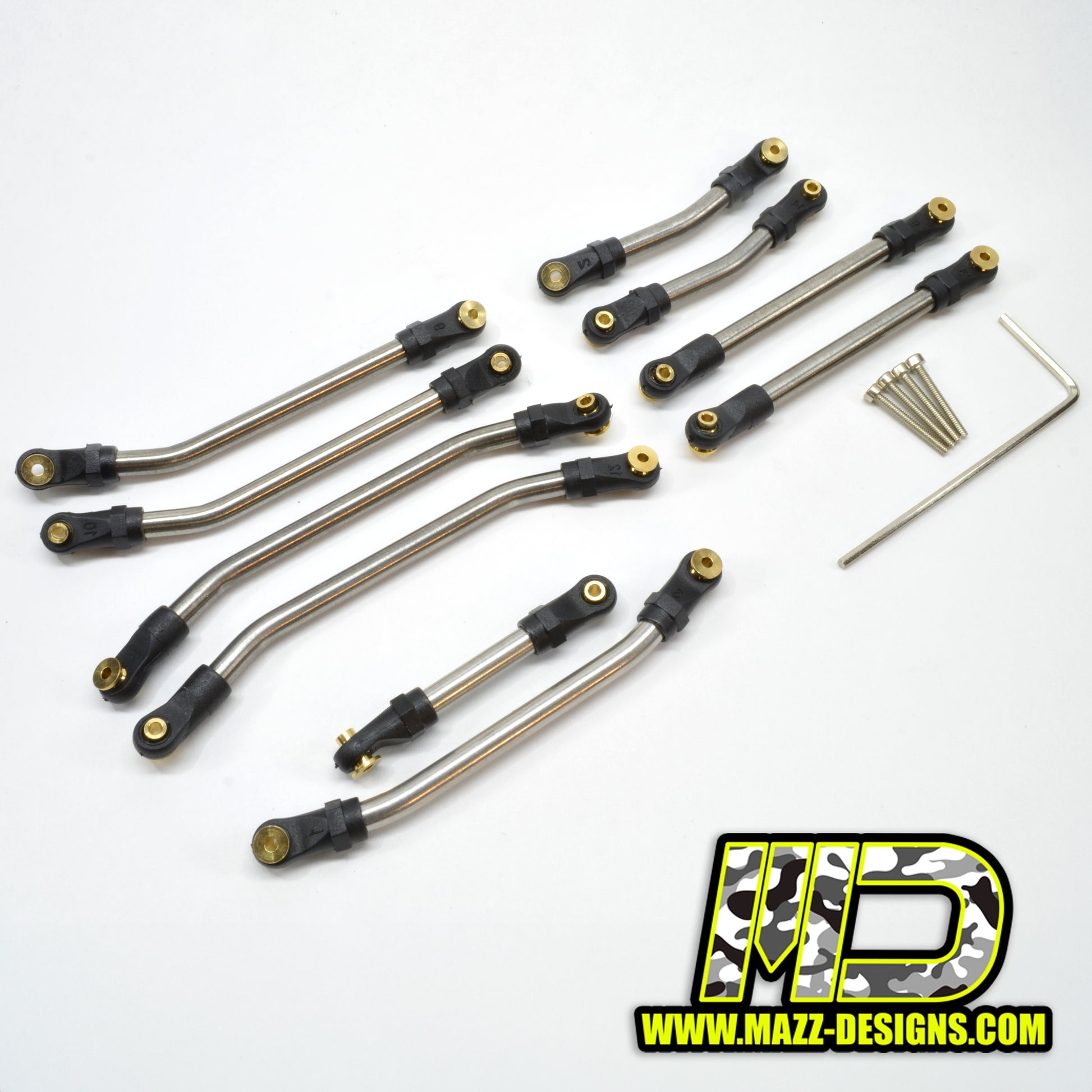The all new Mazz Designs stainless steel double bend suspension and steering links are solid links that have threads machined on each end. 3 styles of injection molded rod ends (see pictures for location information of each). Featuring misalignment rod ends to free up your suspension and not preload the ball ends.